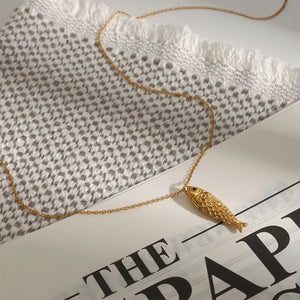 WLL0013815Divertido y simbólico, el collar Numa incorpora un dije de pez dorado con textura en escamas, evocando fluidez, prosperidad y conexión con lo natural. Perfecto para quienes aman lo auténtico y lleno...